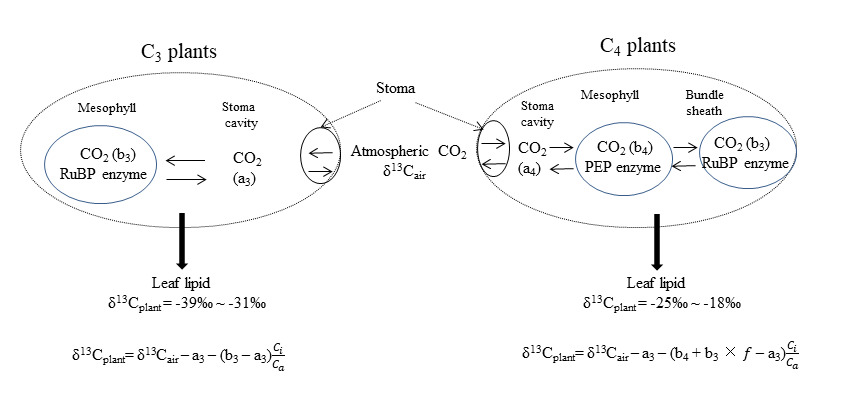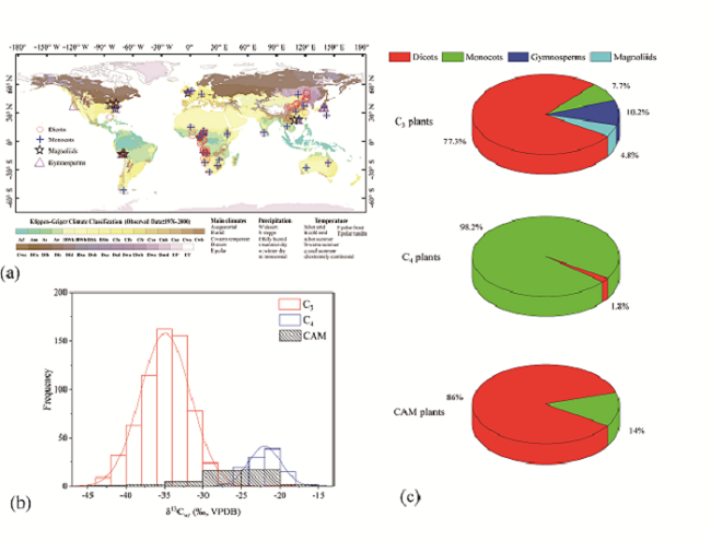 叶蜡正构烷烃碳同位素很好地记录了植物生长时的气候环境状况,是研究陆地过去生态水文环境变化的一个替代性指标。然而,研究发现不同植物类型的叶蜡碳同位素存在显著的差异,不同的光合作用途径(C3、C4、CAM),以及不同的植物类型(单子叶、双子叶、裸子植物等)叶蜡碳同位素存在明显的不同。这种叶蜡碳同位素的“植物类型效应”会给古环境重建造成较大偏差。因此,深入理解植物叶蜡碳同位素的“植物类型效应”机理对于解释古环境至关重要。