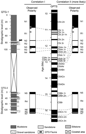泉头沟剖面岩石磁学结果表明,该剖面沉积物中赤铁矿和磁铁矿是主要的载磁矿物。磁性地层学研究表明其剖面记录了7个正极性带和5个负极性带(图1),对应标准极性柱中C5Cn.2n-C5n.2n(或者C5An.1n)的极性带,古地磁年代约为16.5-10(或者12)Ma。其中泉头沟动物群产出的层位为QTG-1剖面三层砂岩顶部的红色泥岩(图1),对应负极性带C5r.3r(或者C5Ar.2r)的顶部,由此限定泉头沟动物群的年代约为11.7(或者12.8)Ma。泉头沟动物群中米仓鼠亚科(Myocricetodontinae)是目前该科动物在东亚地区最老的记录,其年代比西亚和南亚更晚,因此东亚的Myocricetodontinae动物很可能由南亚迁移而来(图2)。泉头沟动物群中啮齿类动物占主导地位,表明中中新世晚期青藏高原东北缘是干旱和开阔的草原环境。