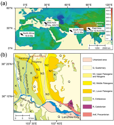 图2 (a) 中新世米仓鼠亚科(Myocricetodontinae)在东亚,南亚,西亚和北非的分布示意图, (b)兰州盆地地质图