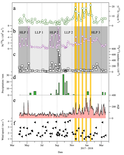 数据显示,放射性的碘-129和自然存在的稳定碘-127均呈夏低冬高的变化特征,但两者来源不同。气溶胶中的自然碘-127来源于本地人为活动排放,其水平与空气质量指数和五次冬季大气重雾霾事件具有显著相关性,揭示了冬季增强的化石燃料燃烧和不利的天气条件对自然碘浓度的影响。与自然碘-127不同的是,研究区的大气碘-129主要来源于欧洲核燃料后处理厂的长距离传输和全球大气沉降。碘-129的时间变化清晰指示,冬季我国受西北冬季风影响,携带欧洲核燃料后处理厂排放的高含量碘-129,而夏季风受环流改变和全球沉降影响,碘-129含量较低。在夏季存在的碘-129的高值与东亚夏季风中断期密切相关,这进一步印证了我国碘-129的含量主要受环流影响。