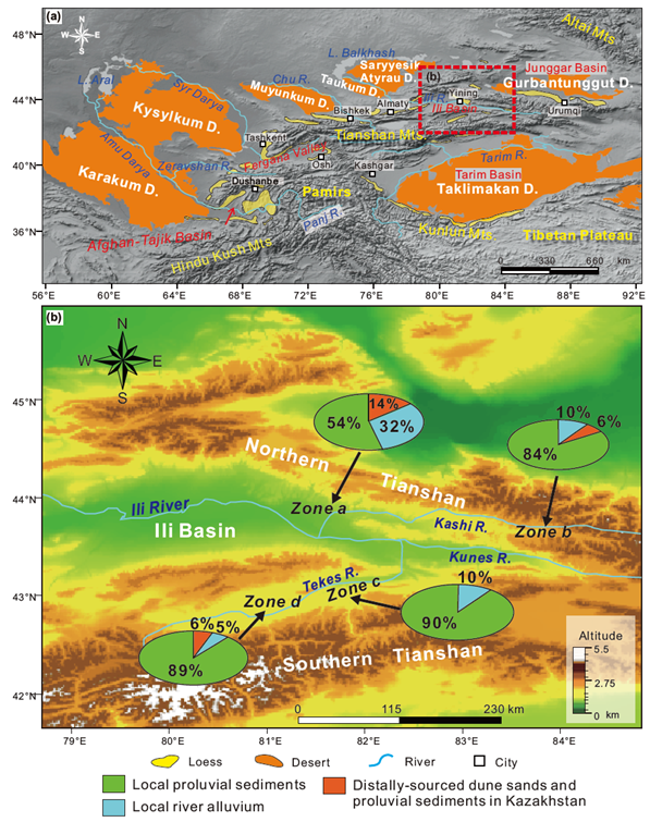 图1 中亚黄土沙漠分布(a)和伊犁盆地黄土中远源的粉尘贡献(b)
