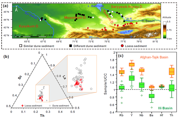 地球环境研究所中亚黄土研究组根据最近几年在中亚黄土元素地球化学示踪方面的工作,结合中亚地区粉尘排放的现代观测数据,认为中亚地区的沙漠并不是中亚山麓黄土的主要物质来源区。通过分析我国西北部伊犁盆地、哈萨克斯坦东南部以及塔吉克斯坦南部的黄土沉积物和塔里木盆地风成沉积物地球化学特征(图1,2),发现在中亚黄土的形成过程中这些地区的沙漠并未扮演着重要的“中间储库”的角色。相反,山麓冲洪积物以及河流冲积物作为中亚黄土和沙尘的最主要的物质来源。这些新的认识也同时得到现代卫星观测资料的证实。因此,中亚黄土并非严格符合MRD模式,系“山地源区-河流搬运”(MR)模式,这对中亚黄土气候代用指标解译和气候古气候重建具有重要意义,同时对研究亚洲起沙、搬运和沉积过程等沙尘循环等提供了重要参考。