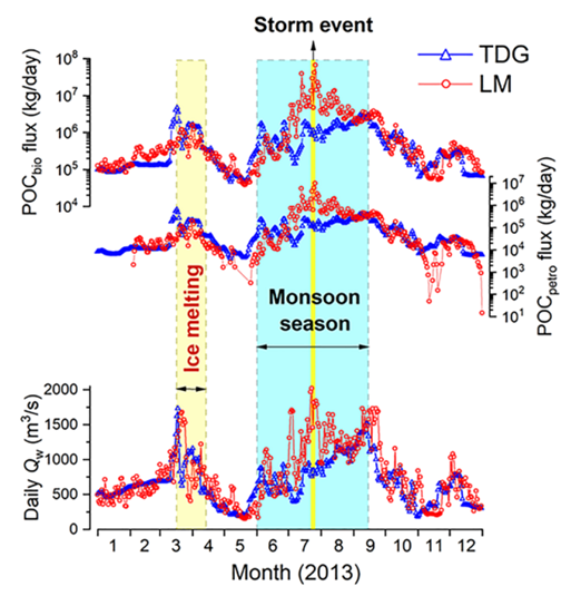中国科学院地球环境研究所金章东研究员团队利用2013年在黄河上游头道拐水文站和中游龙门水文站收集的每周一次的悬浮物样品,以及黄土高原采集的植被、土壤、河床沉积物和岩石样品,通过放射性碳和稳定碳同位素等分析,量化了黄河POC的来源及季节通量。其中,年龄小于6万年的黄土-古土壤可被归类为生物POC(POCbio),不含14C的黄土-古土壤则被归类为化石POC(POCpetro)。结果表明,黄河POC主要来源于黄土高原的C3植被、黄土-古土壤和古老的岩石。通量计算发现,虽然龙门站的流域面积相对于头道拐站仅增加了35%,但其年POCbio和POCpetro的通量却是头道拐站的两倍多,体现了黄土高原POCbio和POCpetro的侵蚀对黄河POC的主导作用。尽管近年来黄河悬浮物输送量大幅度下降,来自黄土高原POCbio和POCpetro产量仍高于世界上大多数大河,分别为3.50 ± 0.59和0.48 ± 0.49 tC/km2/yr。研究还发现,POCbio和POCpetro通量均表现出明显的季节变化:在春季融冰期,主要来源于上游高海拔区域的侵蚀作用;在雨季期,两者的贡献均超过全年的90%,特别是在7月份的一次暴雨期间,五天内的侵蚀通量达到全年的三分之一(见下图),突出了极端水文气候事件对POC输出和碳循环的重要作用。