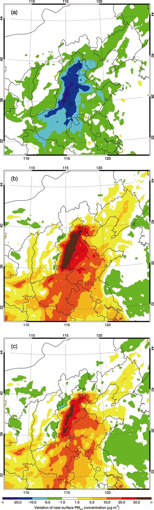 图1. 2015年12月5日到2016年1月4日,由于(a)气溶胶-光解相互作用、(b)气溶胶-辐射相互作用以及(c)二者共同产生的效应对近地面PM2.5质量浓度贡献的空间分布。