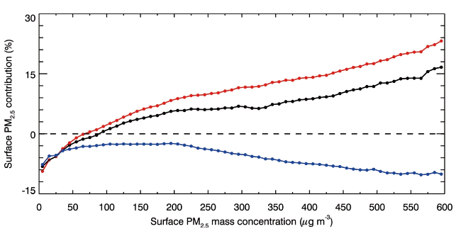 图2. 2015年12月5日到2016年1月4日,随着近地面PM2.5质量浓度的增加,气溶胶-光解相互作用(蓝线)、气溶胶-辐射相互作用(红线)以及二者共同作用(黑线)对近地面PM2.5质量浓度的平均百分比贡献的变化趋势。