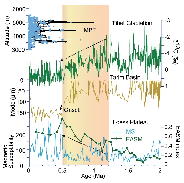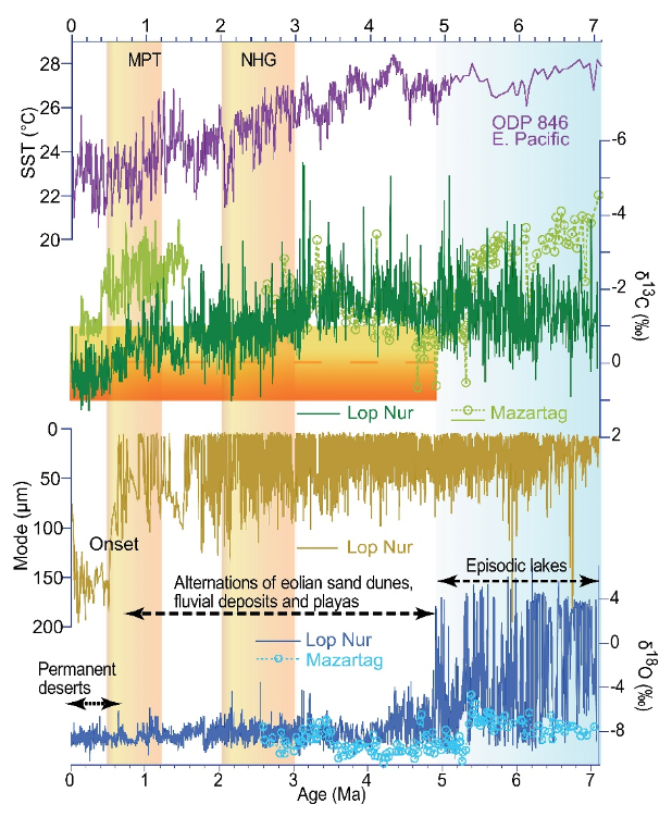 研究结果表明大约4.9百万年(Ma)之前塔里木盆地还存在间歇性的湖泊群,气候明显比当代湿润,证实了周围山体的隆起扩张对水汽的阻隔作用。湖泊群消失后,塔里木盆地仍然交替出现风成沙丘、河流相和浅湖相沉积,并持续了很长一段时间直到0.7 Ma。塔克拉玛干沙漠的最后永久性沙漠形成在0.5- 0.7Ma左右,响应全球中更新世气候转型时期的气候变化。青藏高原山地冰川的出现和大气环流的变化,可能控制了中更新世转型以来亚洲内陆永久沙漠的形成和极端干旱化。