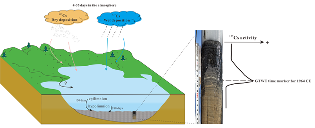 放射性核素137Cs非自然产物,是由人工核试验所产生,并经常用于湖泊表层沉积物定年。我国西北地处北半球中纬地区,位于切尔诺贝利事故的下风方向,区内还存在我国著名的罗布泊核试验基地。因此,该地区湖泊沉积物不仅能记录到1963-1964年全球大气核试验沉降峰值(GTWT),还被认为具备记录到切尔诺贝利核事故(1986年)和罗布泊核试验(1976年)信号的潜力。这一复杂性导致我国西北地区、乃至中国东部和南方地区,湖泊沉积物137Cs活度峰值究竟作为哪一信号的时标而饱受争议,并阻碍了重建过去气候变化、评估人类活动影响和研究人类世起讫时间等众多问题的解决。