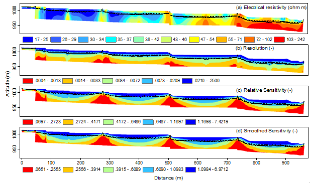 图1 黄土关键带典型剖面的电阻率扫描结果:(a)电阻率,(b)分辨率,(c)相对灵敏度,(d)平滑灵敏度。黑线表示模型分辨率指数为10,大于10说明结果可靠