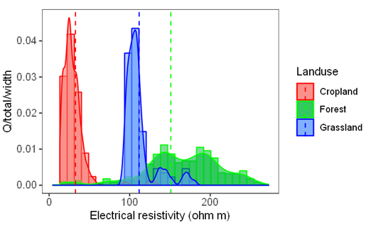 图2 黄土关键带不同土地利用下的电阻率频率分布
