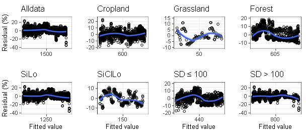 图3 基于不同数据集的电阻率与土壤含水量的最优回归模型的残差分布。Alldata,所有样本数据;SiLo,粉壤土样本数据;SiClLo,粉粘壤土样本数据;SD ≤ 100,0 - 1 m的样本数据;SD > 100,1 m以下样本数据