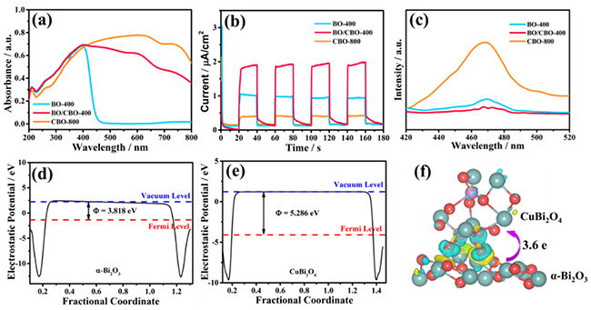 图1(a) 紫外可见光吸收图谱,(b) 光电流分析图,(c) 荧光信号分析图,α-Bi2O3 (d)和CuBi2O4 (e)功函数图, α-Bi2O3/CuBi2O4 Z型异质结界面差分电荷图(f)