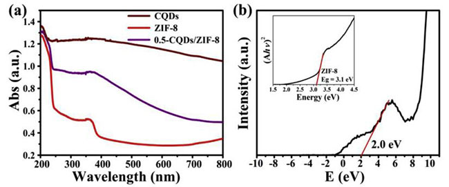 图4 (a) CODs、ZIF-8和0.5-CQDs/ZIF-8材料的UV-vis光谱,(b)ZIF-8的XPS价带谱