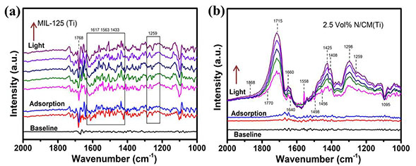 图5 (a)可见光条件下MIL-125(Ti), (b) 2.5 Vol% N/CM(Ti)光催化NO的原位光谱图