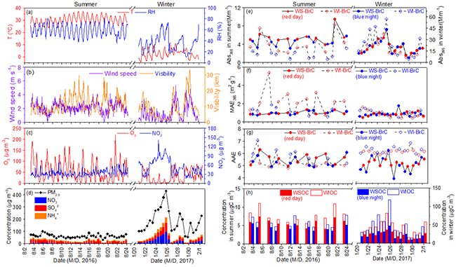 图1. 气象参数、主要化学组分浓度、Abs365、 MAC365和AAE的时间变化