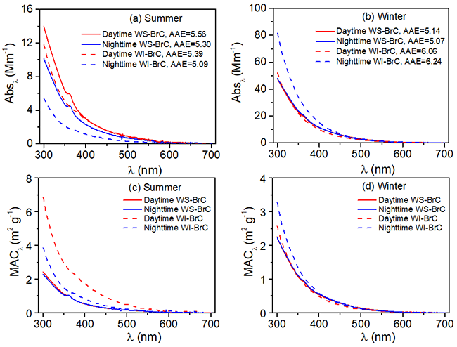 中国科学院地球环境研究所李建军博士联合国内外多家研究机构和大学,通过水和乙腈分步萃取的方式,研究了关中渭南农村地区大气PM2.5中水溶性(WS-BrC)和非水溶性棕碳(WI-BrC)化合物的光学特性和分子组成。结果表明冬季WS-BrC和WI-BrC的吸收系数(Abs)均显著高于夏季,这主要与冬季农村地区生物质燃烧取暖有关。夏季昼夜WS-BrC在365 nm的质量吸收系数(MAC365)接近,然而WI-BrC在白天的MAC365比夜晚高出一倍。分子组成的结果证实这与白天二次棕碳(如OPAHs)的生成有关。冬季WS-BrC的Abs与相对湿度、硫酸盐和NO2均呈现显著的相关性,证实冬季液相氧化对WS-BrC具有重要的贡献。估算得出夏季WS-BrC和WI-BrC对太阳紫外光辐射的吸收率分别为0.83±0.23% 和0.53±0.33%,冬季为1.67±0.72%和2.07±1.24%。而总BrC在紫外范围内的吸收约为黑碳的55-79%。