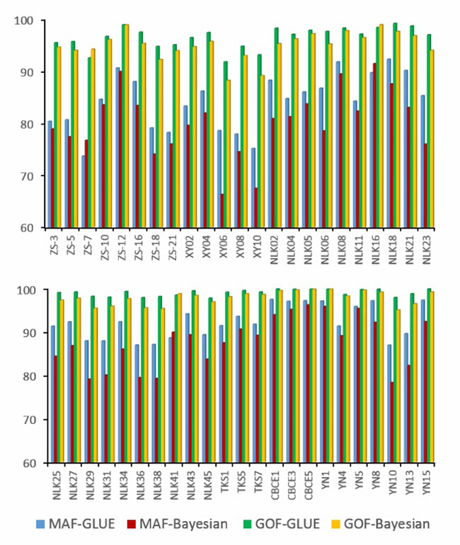 图1 拟合优度(GOF)和平均绝对拟合(MAF)用于评价贝叶斯模型和不确定性分析法(GLUE)模型在预测目标黄土样本元素地球化学中的表现
