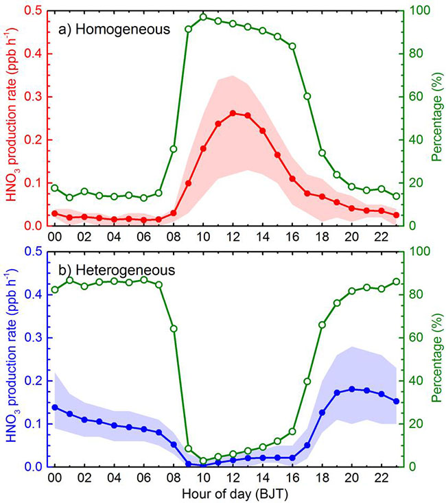 图1 HNO3的均相和非均相生成速率的平均日变化趋势。其中红线代表HNO3均相途径的生成速率,蓝线代表非均相途径的生成速率,绿线为百分比。