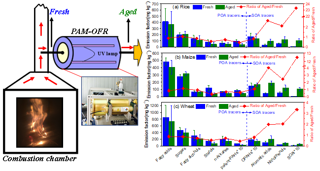 图1. 生物质燃烧排放和老化模拟装置示意图及主要有机物组分的贡献