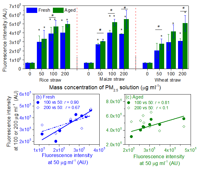 中国科学院地球环境研究所李建军博士联合国内外多家研究机构和大学,通过搭建“燃烧舱+流体反应器”系统模拟了水稻、玉米和小麦等主要作物秸秆的燃烧、排放和传输过程,并同步收集燃烧排放的新鲜粒子和模拟老化2天后的老化颗粒物。化学组分分析的结果显示有机物是这些颗粒物中的主要化学成分,占比超过75%。其中脱水糖苷和脂肪酸类有机物相对比较稳定,正构烷烃、多环芳烃和脂肪醇类有机物容易被进一步氧化,而邻苯二甲酸、硝基酚和异戊二烯的产物等则主要通过二次氧化生成。人体支气管上皮BEAS-2B细胞的体外实验结果表明老化颗粒物的氧化应激高于新鲜颗粒,直接证实了大气老化过程会增强生物质燃烧颗粒物的氧化应激。新鲜颗粒物的氧化应激与过渡金属和多环芳烃类化合物具有显著的相关性,而老化颗粒物氧化应激的升高可能与二次有害有机物(如含氮有机物)等的生成有关。