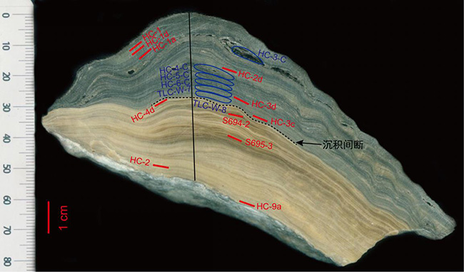 黄巢洞以唐末叛军首领黄巢(AD820~884)而命名,据传据史料记载, 黄巢于AD884去世后, 他手下的部队躲在洞穴中, 继续与唐朝军队作战。至今在洞穴大厅中还能看到石阶遗迹, 据传是军队的议事厅。石笋HC2的剖面存在清晰可见的沉积间断,石笋上部因包裹大量的炭屑使得间断上下的颜色显著不同(图1)。高精度230Th和AMS 14C定年结果显示HC2的生长时段为174BC~ AD1810, 沉积间断发生在AD638~1102之间。沿石笋生长轴的碳氧同位素和微量元素分析结果显示: