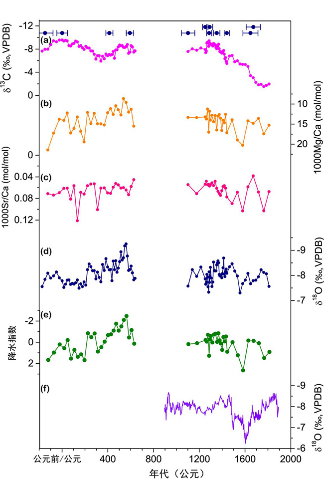 (1)HC2的δ18O、Mg/Ca和Sr/Ca变化呈现一致性(图2),表明它们共同受控于当地降水量的变化。这也与前人对中国北方石笋δ18O的指示意义不谋而合。作者通过主成分分析方法对三者的记录进行集成,将可以解释总方差53%的PCA1作为山东中部地区的降水指数(图2,正值表示降水较少,反之则反),揭示了山东地区2200年来的降水变化:在2世纪比之间的200年有所减少,3世纪时降水逐渐增多,直至6世纪中叶达到最湿润期,之后降水量逐渐减少。因沉积间断的存在,AD640~1102的降水情况无法知晓。12~15世纪相对湿润,13世纪后期出现干旱,从16世纪开始降水量减少。16世纪末最干旱,之后降水量逐渐增加,并在18世纪再次减少。