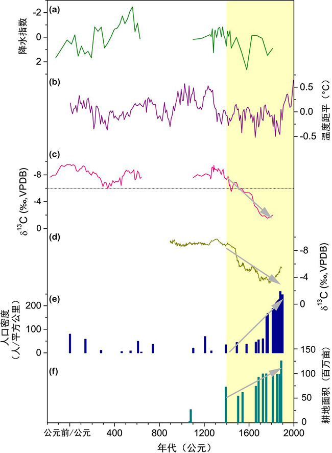 (a) 黄巢洞石笋HC2重建的山东中部降水变化; (b) 过去2000年中国年均温度变化; (c) 黄巢洞石笋HC2的δ13C记录; (d) 开元洞石笋KY1的δ13C记录; (e) 山东历史时期的人口密度; (f) 山东历史时期的耕地面积. (c)中的虚线指示δ13C为-6‰. 灰色箭头表示石笋δ13C、人口密度和农田面积自15世纪以来的增长趋势