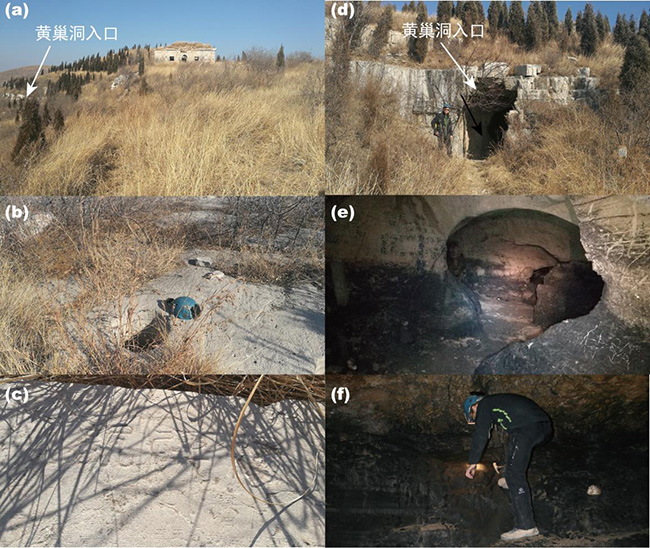 (a) 黄巢洞上覆植被以及被废弃的寺庙; (b) 寺庙前残存的古建筑构件; (c) 记录寺庙重修过程的石碑(重修于明万历乙酉年AD1585); (d) 黄巢洞入口; (e) 洞穴内部厅室, 在洞壁和地板上可见大量碳屑、题词以及刻痕; (f) 石笋HC2采样照