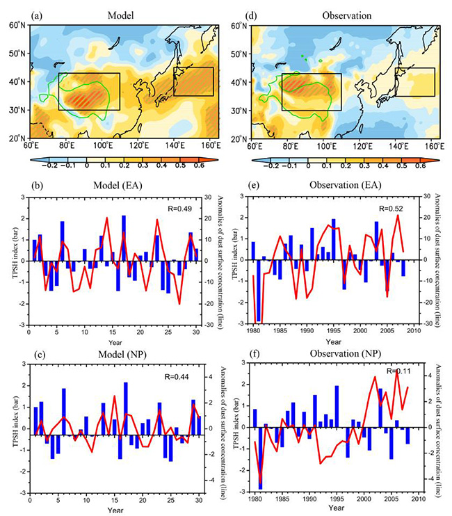 图1. 青藏高原春季地表感热与东亚地区及西北太平洋区域地表沙尘浓度的正相关关系: (a) 30年的模拟结果,(d) 1980-2008年观测结果。东亚地区及西北太平洋区域平均地表沙尘浓度(红线)和青藏高原感热(蓝线)的时间变化序列:(b, c)模拟结果,(e, f)观测结果。