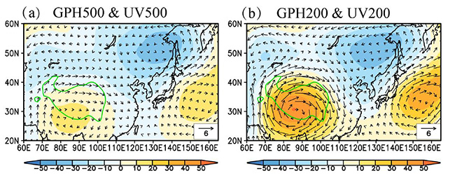 图2. 青藏高原地表感热强弱年差异引起的中高层位势高度异常以及环流异常(感热强年-感热弱年)。