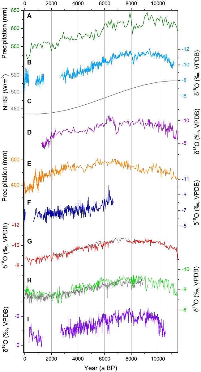 图1. 乌鸦洞δ18O记录与亚洲夏季风北缘模拟的降水变化以及季风区其他记录对比