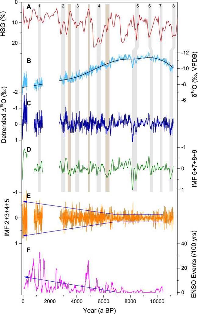 图2. 乌鸦洞石笋δ18O记录的全新世亚洲夏季风变化与北大西洋IRD事件及ENSO变化对比