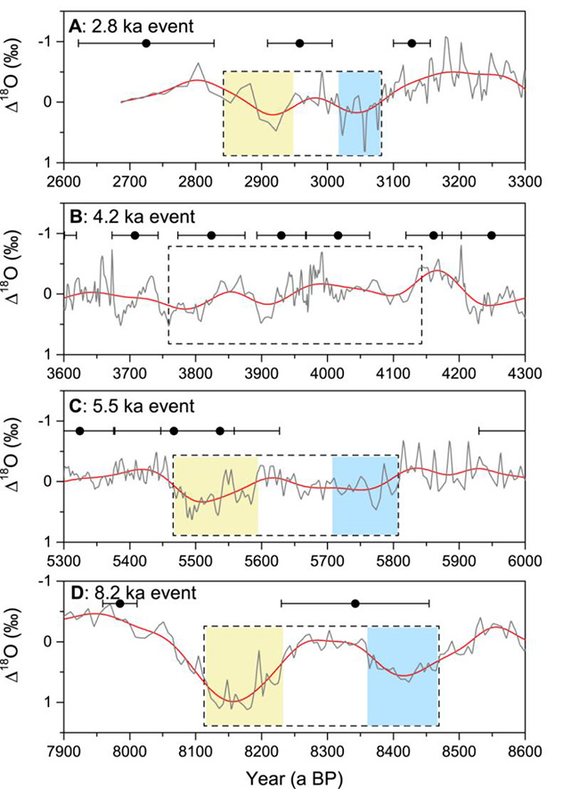 研究人员详细研究了这一区域全新世的季风突变事件,发现乌鸦洞石笋的δ18O清楚记录了与Bond事件1~8对应的季风减弱事件,峰值发生年代为1.19、2.92、3.90、5.49、8.15、9.55、10.52、11.01 ka BP(图2)。另外,还记录了另外3次以3.53、4.90、6.26 ka BP为中心的弱季风事件。在这些突变事件中,8.2 ka事件最为显著。通过对这些突变事件结构的分析,进一步发现8.2、5.5、2.8 ka事件的内部结构相似(图3),为两谷夹一峰结构,可能受控于太阳活动,其信号在8.2 ka时被融冰水放大;而4.2 ka事件则不同,是在长期季风衰弱下的渐变状态。