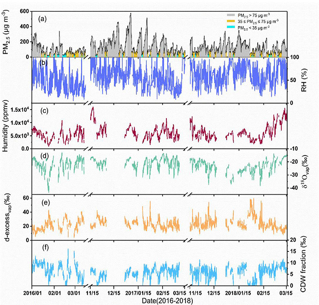 图2 2016-2018年西安市采暖季主要指标时间序列变化: (a)PM2.5浓度;(b)相对湿度;(c)绝对湿度;(d)d18Ovap;(e)dvap-excess;(f) CDW在大气水汽占比.