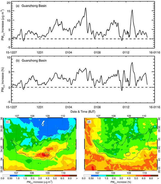 随后,研究人员利用WRF-Chem模型,选取一次典型重霾天气污染过程,结合大气水汽同位素结果计算得到的燃烧源水汽在大气水汽中的占比,定量评估了燃烧源水汽对于大气PM2.5浓度的贡献。模拟结果表明,化石燃烧源水汽对于关中地区大气总PM2.5平均贡献为2.8%,最高为8%(图3);而对人为贡献的PM2.5的占比平均为5.1%,最高为18.2%。