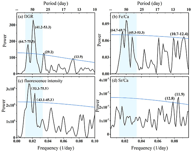 图1:2012-2013年现代砗磲样品生物地球化学序列中记录的MJO周期信号。(a)天生长速率,(b)Fe/Ca,(c)荧光强度和(d)Sr/Ca序列的功率谱图。所有时间序列都进行了高通滤波以去除季节到年际变化的影响。浅蓝色阴影表示MJO的功率谱范围,蓝线表示95%置信度,显著峰值用数值表示(单位为:天)。