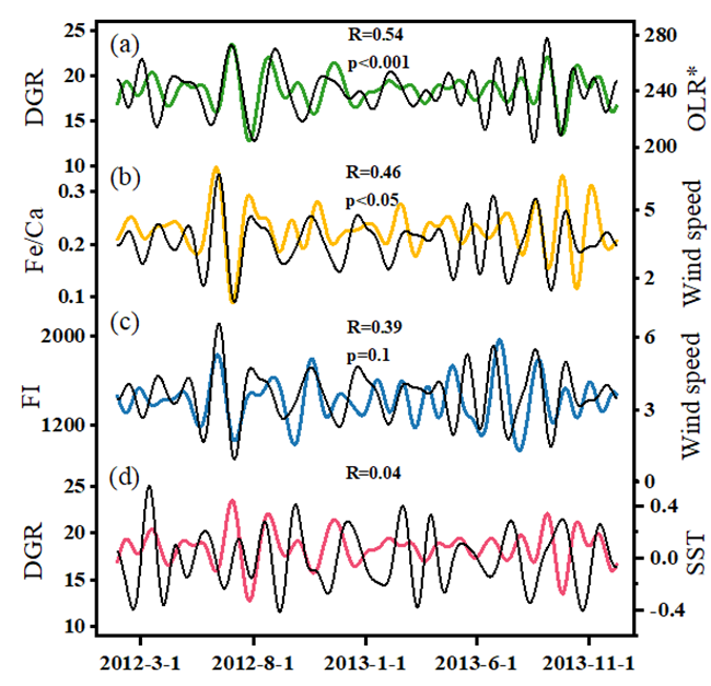 图2:砗磲代用记录和当地气象资料的相关性图。(a)DGR(绿线)和OLR*(黑线),(b)Fe/Ca(黄线)和风速(黑线),(c)荧光强度(蓝线)和风速(黑线),(d)DGR(红线)和海表面温度(黑线)。所有时间序列都进行了30-90天带通滤波。