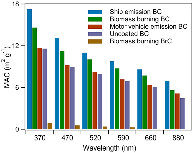 图1. 不同源黑碳和棕碳的质量吸收横截面(MAC)随波长的分布。