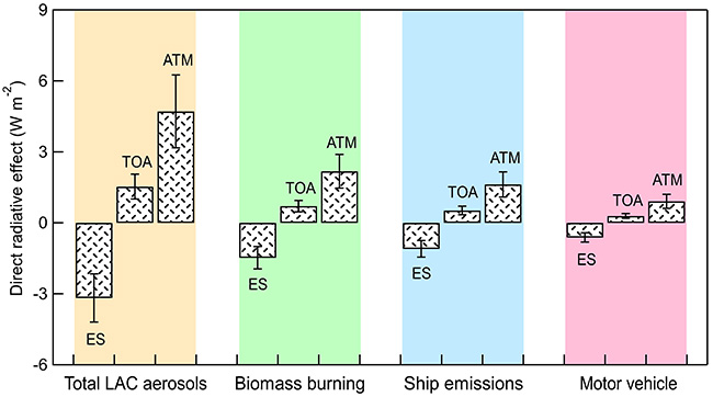 图2. 生物质燃烧、船舶排放以及机动车排放吸光性碳气溶胶产生的辐射效应。