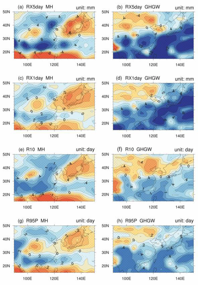 图1.中全新世(a,c,e,g)与未来暖期(b,d,f,h)夏季极端降水变化。采用四个极端降雨指标:(a, b) RX5day; (c, d) RX1day; (e, f) R10; (g, h) R95P。