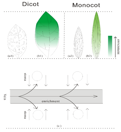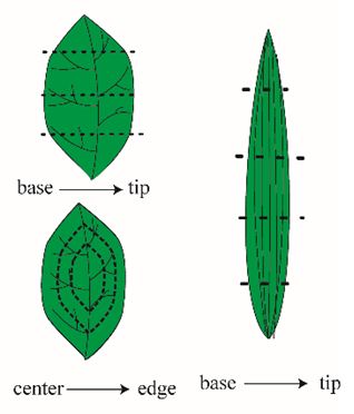 最近,地球环境研究所古环境研究室刘金召副研究员联合清华大学林光辉教授通过在我国黄土高原收集不同植物叶片,按照不同植物类型(单子叶和双子叶)叶片脉络结构进行切割处理(图 1)。对切割的植物样品进行叶片水和叶蜡氢同位素分析,发现单子叶植物叶蜡氢同位素从叶片底部到顶部呈现同位素富集现象,而双子叶叶片从底部到顶部以及中心到边缘均存在同位素富集现象;而且对应的叶片水氢同位素也存在一致的变化特征。这种植物叶片水和叶蜡同位素在叶片内部一致的变化特征暗示叶蜡氢同位素内部的空间分布的主要原因来自于叶片水的氢同位素空间分布特征。