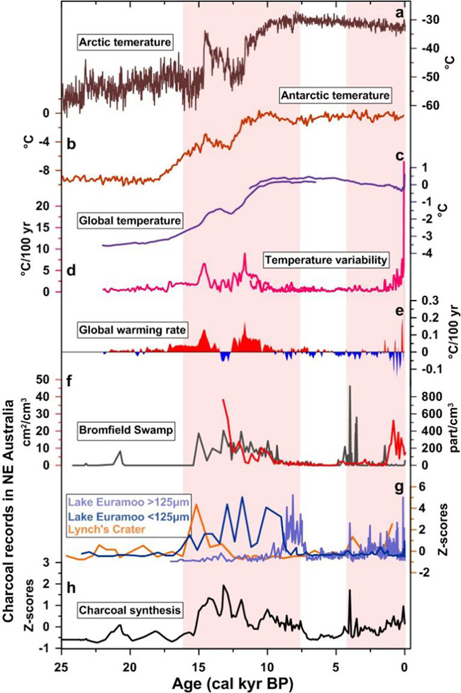 图1 澳大利亚东北部碳屑记录与过去25000年全球温度记录对比。(a)北极温度记录;(b)南极温度记录;(c)全球温度集成记录;(d)全球温度变率;(e)全球升温速率;(f)Bromfield Swamp碳屑记录;(g)澳大利亚东北部其它碳屑记录;(h)出现在(f)和(g)中碳屑记录的集成。