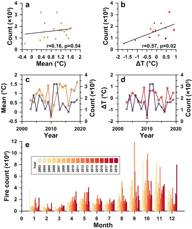 末次冰消期快速变暖是当前全球变暖的理想参照。对澳大利亚2003-2019年火灾数量与温度之间关系的研究也表明,相较于平均温度条件,火灾数量与每两年间升温幅度的关系更密切(图2)。
