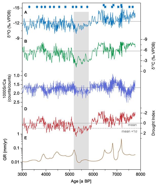 图2. Talisman洞石笋氧、碳同位素及微量元素集成重建的中亚地区在7800~3000年期间的降雨变化。灰色柱条表示发生于5820~5180年期间的超级干旱事件。