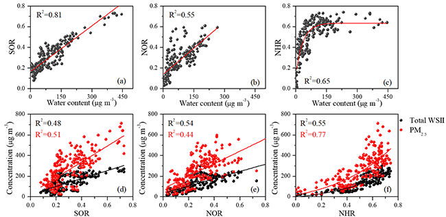 图. SOR,NOR和NHR与气溶胶水含量的散点图(a-c),总水溶性无机离子和PM2.5浓度与SOR,NOR和NHR的散点图(d-f).