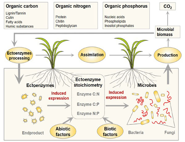 中科院地球环境研究所生态环境研究室王云强生态水文团队杨阳副研究员联合了加拿大阿尔伯塔大学、西北农林科技大学、中科院沈阳应用生态研究所、中科院西北生态环境资源研究院、四川农业大学等多家科研团队,首先建立了土壤微生物和胞外酶参与的土壤有机碳循环潜在关联示意图(图1),进而评估了黄土高原地区不同年限(1、5、10、15、25和30年)草地恢复区的微生物营养限制及其与土壤微生物群落结构的相关性,并通过分析了EES(包括参与碳(C)、氮(N)、磷(P)循环的相关酶),非生物因素(土壤pH值、土壤湿度(SM)、有机碳(SOC)、总氮(STN)、总磷(STP),及其元素比率)和生物因素(土壤微生物碳(SMBC)、氮(SMBN)和磷(SMBP)及其元素比率)。