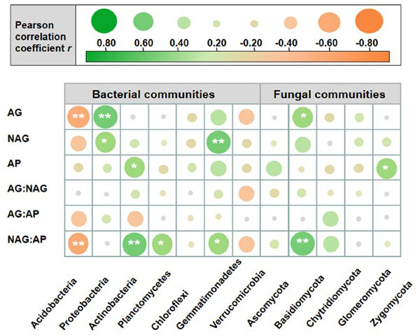 对于土壤微生物群落结构,土壤细菌的优势菌群包括放线菌门、变形菌门和酸杆菌门(相对丰度> 5%);土壤真菌的优势菌包括子囊菌门、担子菌门和壶菌门(相对丰度> 5%)。相关分析表明,酸杆菌相对丰度与AG:NAG、NAG:AP呈正相关;变形菌门的相对丰度与AG:NAG呈正相关,与AG活性呈负相关。对于真菌,担子菌门和子囊菌门的相对丰度与NAG活性、NAG:AP呈正相关,与AG:NAG呈负相关。总的来说,真菌门(子囊菌门、担子菌门)和细菌门(酸杆菌门)的相对丰度与外酶化学计量比密切相关(图3),最终导致土壤微生物从生长缓慢的寡营养类群向快速生长的共生营养类群的转变,这些由外酶化学计量比驱动的微生物群落组成和结构的差异,反映了草地恢复后土壤微生物参与的碳循环特征(Yang, et al., AGEE, 2021)。由于不同微生物分泌的多种胞外酶都参与土壤有机碳的转化和降解,因此未来的研究应当明确挖掘其相对应的微生物功能基因,以便在后续研究中能够单独考虑这些基因,从土壤微生物的角度为优化土壤碳动态模型提供一条新的途径。