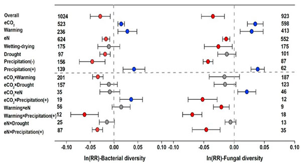 图5 土壤细菌(左)和真菌(右)多样性对全球变化因子(二氧化碳(eCO2)升高、气候变暖、氮添加量(eN,即氮沉降量)升高、干湿循环、干旱、降水及其多因素间交互效应的响应