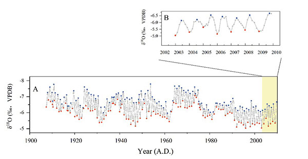 图1: (A)祥龙洞石笋XL21的δ18O序列,蓝点与红点分别代表年旋回内最负值与最正值.(B)δ18O年旋回放大图.