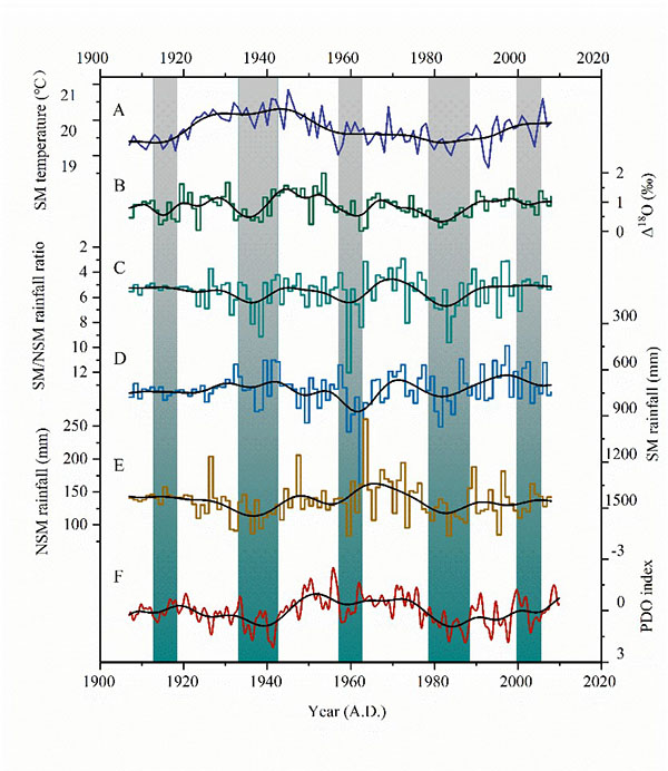 最近,中国科学院地球环境研究所谭亮成研究员课题组对秦岭南部祥龙洞高分辨率(~0.16年)的年纹层石笋δ18O序列进行了研究,评估了δ18O季节变化幅度(年循环内最正值与最负值的差异)作为降水季节性变化指标的潜力。基于此重建了过去百年我国中部地区的降水季节性变化序列,讨论了太平洋年代际涛动(PDO)对降水季节性的可能影响。主要取得以下几点认识: