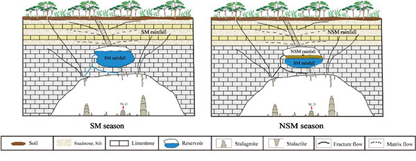 (2)通过与器测资料对比,发现Δ18O与夏季风与非夏季风降雨量比值(SM/NSM rainfall ratio)呈显著负相关(图2),进一步证实Δ18O是重建降水季节性变化的可靠指标。两者之间的负相关关系可能受控于洞穴补给机制,在此洞穴补给模型中,XL21主要由SM降雨补给(图3)。在夏季风时期,石笋δ18O主要受SM降水δ18O影响,逐渐偏负。而在非夏季风时期,SM降水储存在上覆蓄水池与NSM降水一起维持洞穴滴水(图3)。因此,当SM降雨量越多时,δ18O最负值和最正值都越小。但是,在NSM时期,随着具有偏正δ18O特征的NSM降雨的加入,其相对SM降雨比例的增加导致δ18O最正值相应增大,这将导致Δ18O的增加,造成Δ18O与SM/NSM降雨量的负相关关系。